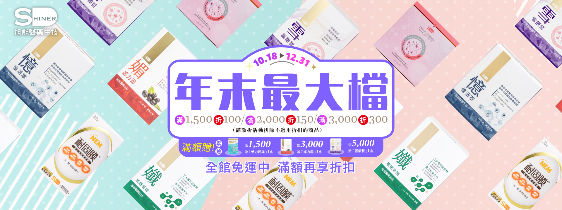 旭能雙11|全館免運+滿額三重禮:$1500送活力鈣鎂($1280)/$3000再送媚力固($1880)/$5000再加碼雪靓皙($2100)——可累贈